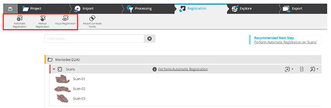 - You can access the Registration menu by clicking on the button Registration. Here you can choose between Automatic, Manual and Visual registration. You may want to choose Manual Registration if you haven’t worked with targets or limited overlapping areas.