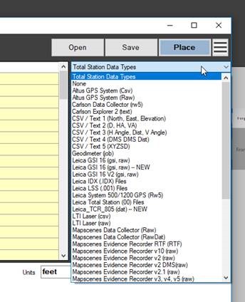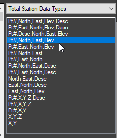 - Click the bar labeled Total Station Data Types to display the list. If your device is listed, select it from the list. If it is not listed, use a common format like .txt or .csv.